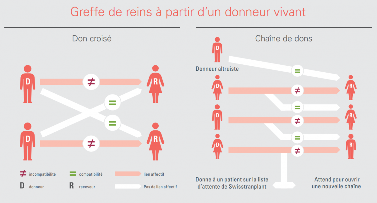 Un donneur vivant peut aussi vouloir offrir un rein à un patient qui souffre d’insuffisance rénale et est dialysé, mais qu’il ne connaît pas. Dans ce cas-là, le don demeure anonyme. C’est Swisstransplant qui attribue le rein au patient le plus compatible en liste d’attente, selon les mêmes critères d’allocation que pour un donneur décédé. Cette forme de don non dirigée, altruiste, ne peut pas encore intervenir dans le programme de dons croisés. «Nous menons des discussions avec l’Office fédéral de la santé publique (OFSP) pour qu’une ordonnance autorise ces donneurs altruistes à s’impliquer dans les dons croisés en initiant une chaîne, comme c’est déjà le cas dans de nombreux pays et notamment aux Pays-Bas, leader européen dans le domaine. Ce système permet, en moyenne, à cinq patients provenant de couples incompatibles d’être greffés», explique la Dre Hadaya.